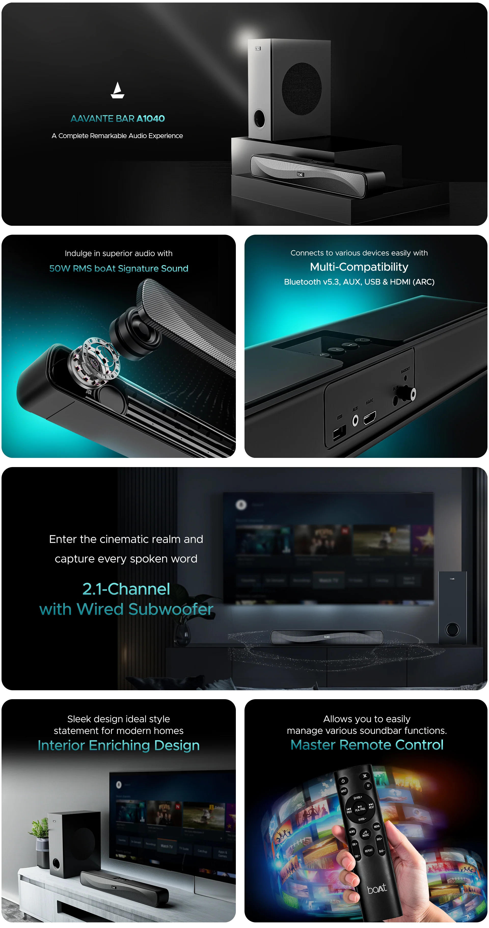 boAt Aavante Bar A1040 with 50 W RMS boAt Signature Sound, 2.1 Channel Audio with Wired Subwoofer, Multi connectivity : Bluetooth v5.3, AUX, USB & HDMI and Master Remote Control (Premium Black)