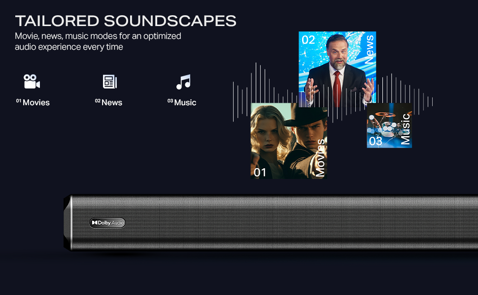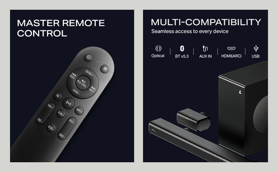 - Bluetooth v5.3, HDMI(ARC), USB, AUX, Optical