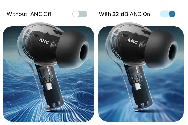 - Up to 32 dB Active Noise Cancellation: Take a step back from the real world with crystal-clear audio. These earbuds enable you to experience high-quality tunes and podcasts thanks to the impressive external noise cancellation of up to 32 dB.