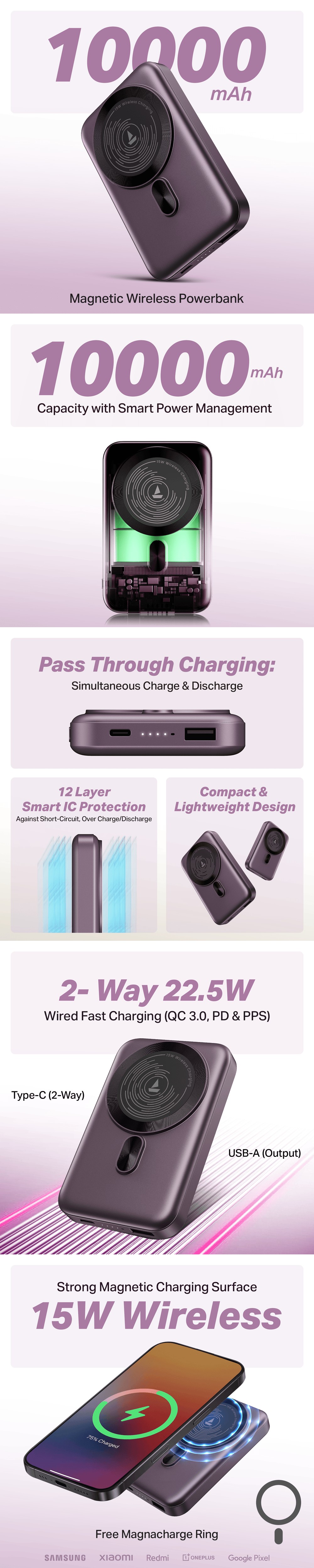 boAt EnergyShroom PB331 MagnaCharge, 10000 mAh Power Bank, 22.5 Wired Charging & 15 W Wireless Charging, Dual Port Type A & C, Fast Charging, 12 Layer Smart IC Protection, Ash Black