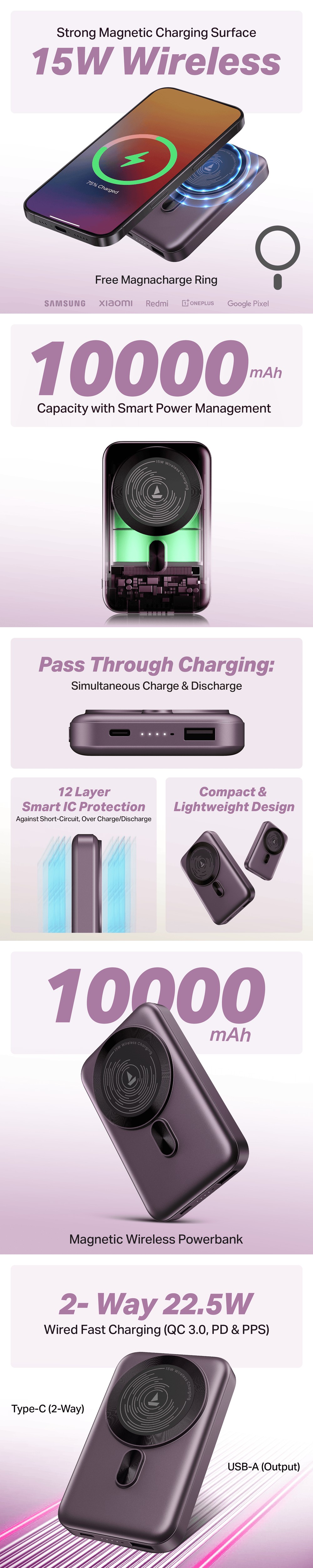 boAt EnergyShroom PB331 MagnaCharge, 10000 mAh Power Bank, 22.5 Wired Charging & 15 W Wireless Charging, Dual Port Type A & C, Fast Charging, 12 Layer Smart IC Protection, Purple