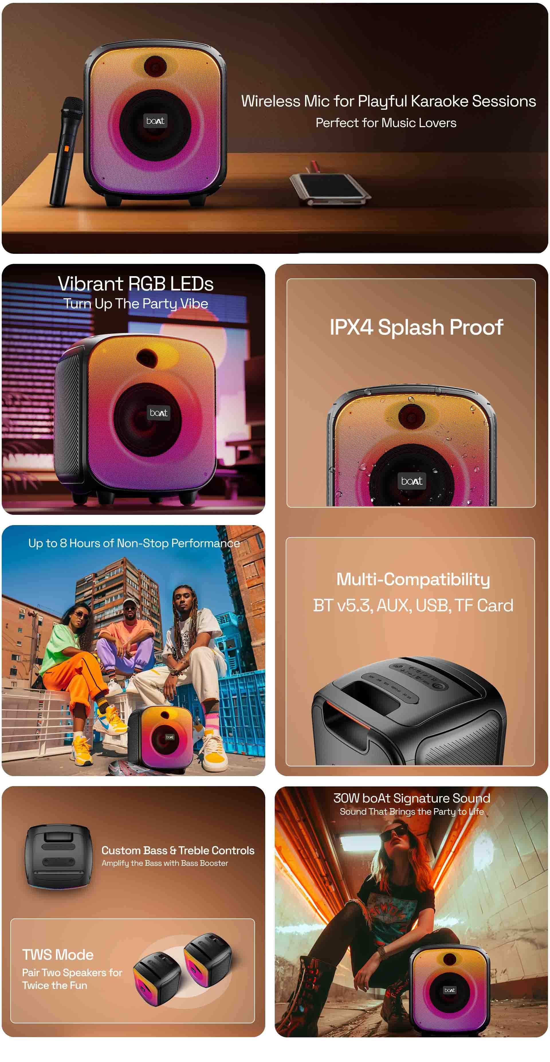 - 30 W boAt Signature Sound: Enjoy bass-heavy boAt Signature Sound from the PartyPal 63 Pro Bluetooth Speaker. The powerful 30 W output fills the room with captivating audio for endless fun