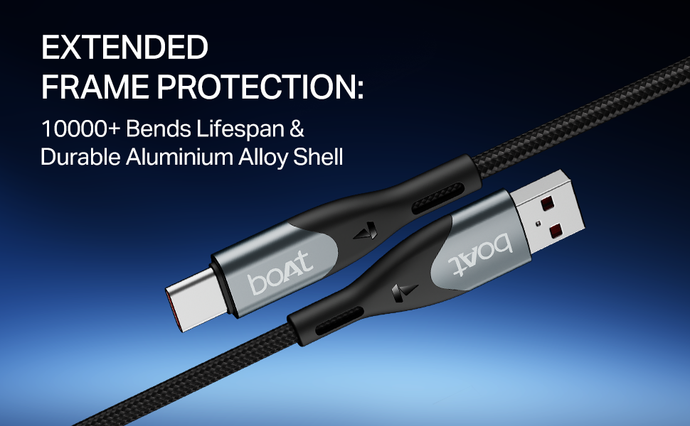 - Extended Frame Protection—10000+ Bends Lifespan & Durable Aluminium Alloy Shell: With extended frame protection, the cable is built to withstand daily wear and tear with ease. Furthermore, the 10000+ bends lifespan ensures long-term structural strength, making it ideal for rugged usage. Additionally, the durable aluminium alloy shells at both connector heads resist corrosion, heat, and impact — ensuring lasting protection
