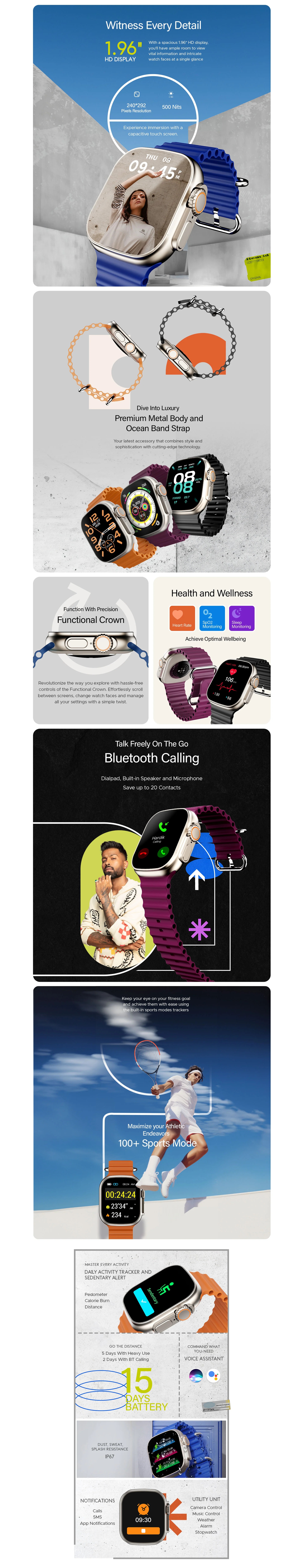 - Advanced Bluetooth Calling, 100+ Sports Modes, Heart Rate & Blood Oxygen Monitoring, Stress Monitoring