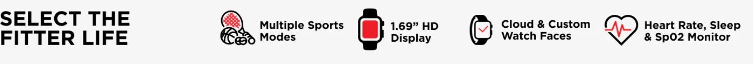 Introducing Wave Select, the watch of all watches. Now pursue your fitness journey in style with its beautiful 4.29 cm (1.69 inch) colour HD display and 20+ active sport modes. Maintain a healthy life with its heart-rate & SpO2 monitor and multiple sedentary & hydration alerts. Never miss a beat with a long-lasting 10 day battery life that keeps you connected to your world, always.