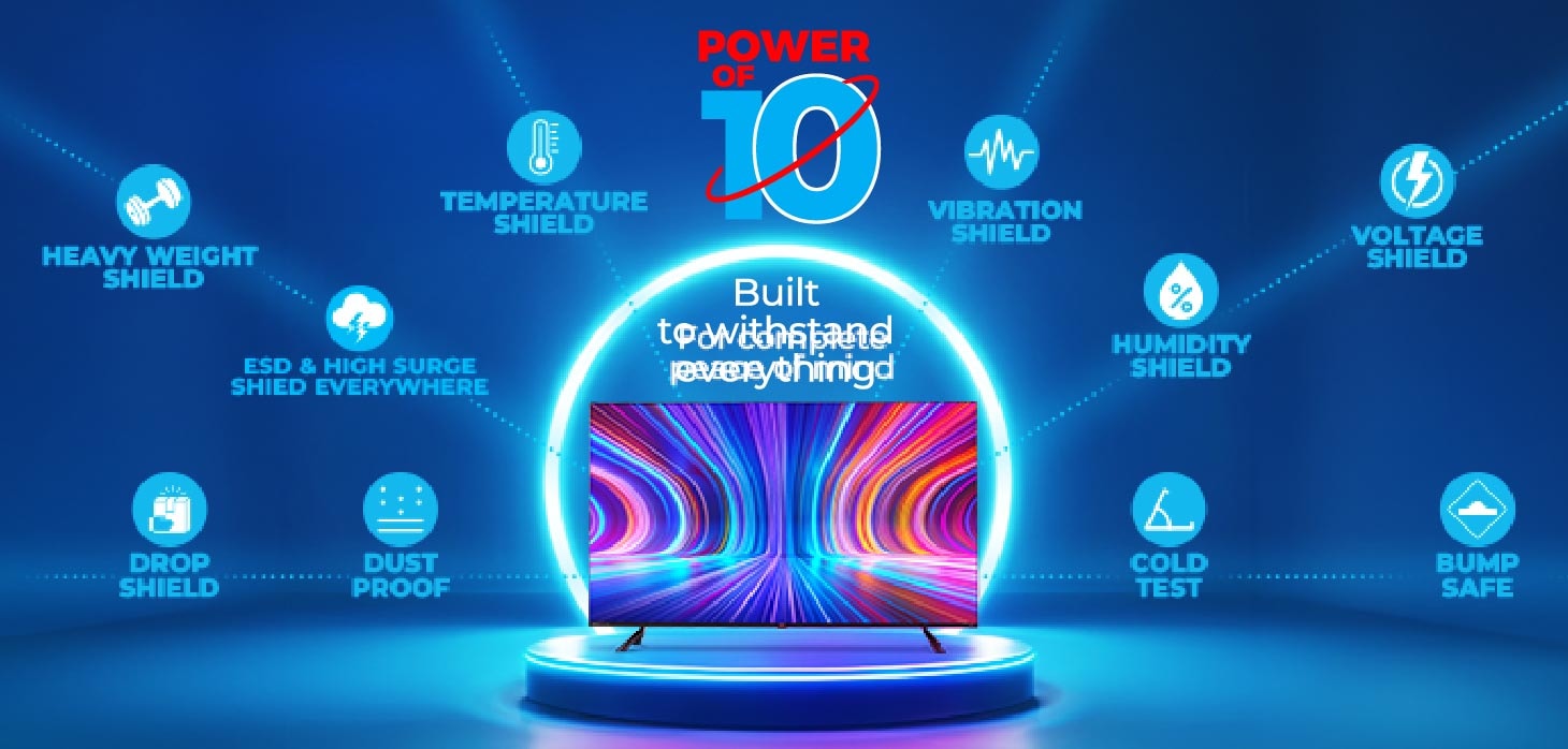 Power of 10BPL TVs are designed to stay safe and secure in any situation. They come with a host of comprehensive safety features, including Lightening Shield, Humidity Shield, Temperature Shield, Voltage Shield, Heavy Weight Shield, Vibration Shield, Slide Proof, Drop Shield, Bump Safe and Dust Safe.