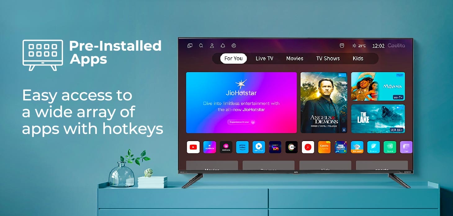 Pre-Installed ApplicationsThe TV comes with a list of pre-installed applications such as Jiohotstar,Amazon Prime Video, Youtube, etc. along with all the popular apps, which can be easily accessed through hotkeys.