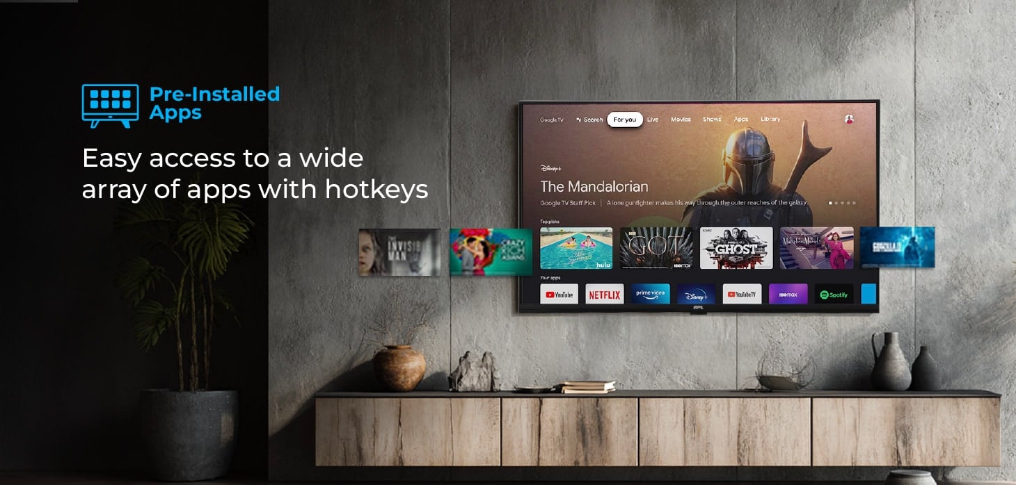 The TV comes with a list of pre-installed applications such as JioHotstar, Amazon Prime Video, YouTube, etc. along with all the popular apps, which can be easily accessed through hotkeys