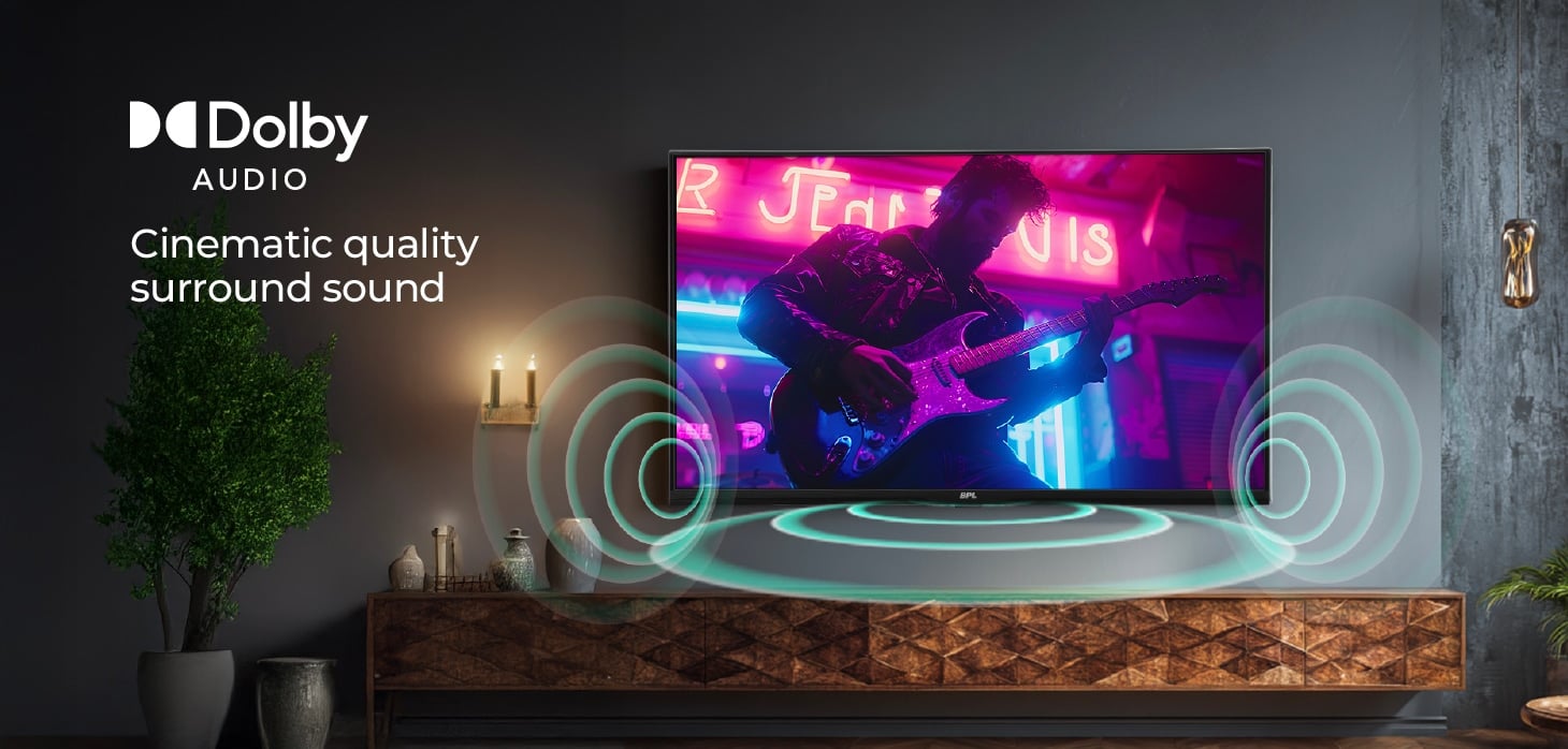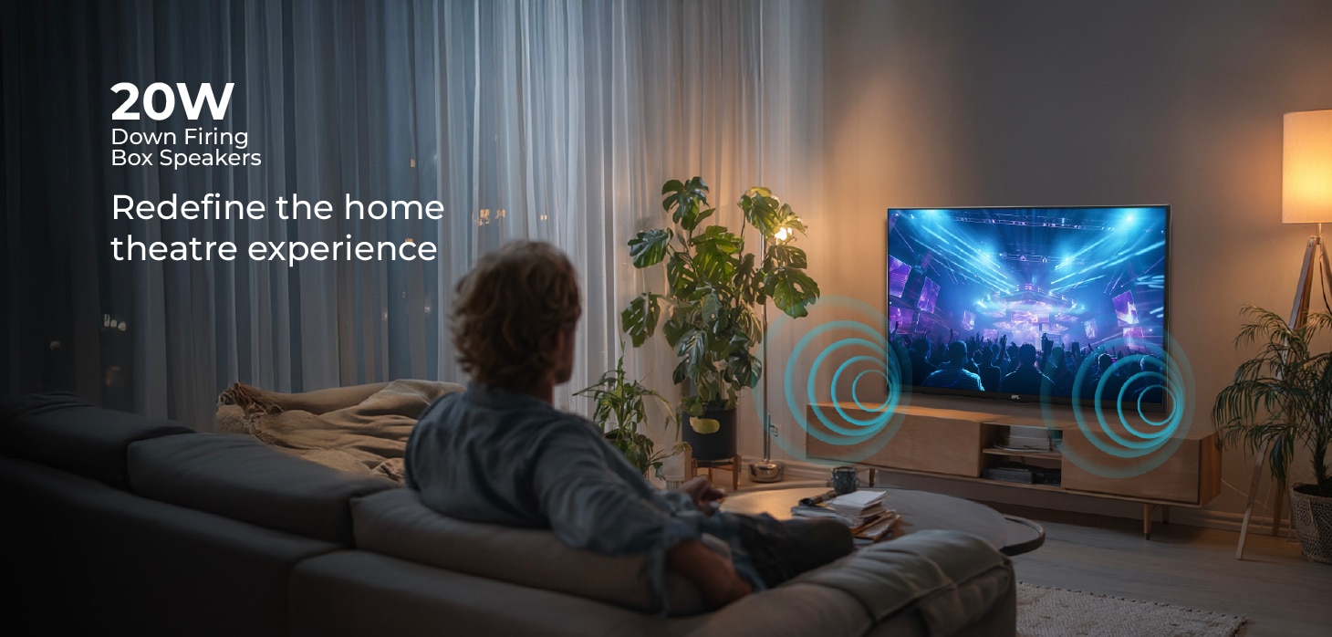 Feel every beat with 20W down-firing box speakers on your 32-inch TV. With 5 customizable audio modes—including Movie, Music, and Stadium—Audio delivers immersive surround sound tailored to your content.