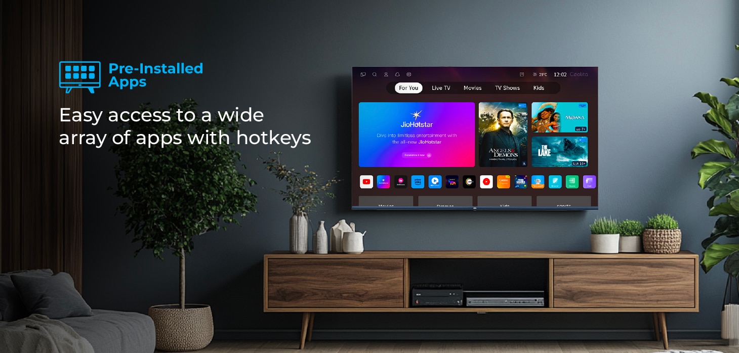 The TV comes with a list of pre-installed applications such as JioHotstar, Amazon Prime Video, YouTube, etc. along with all the popular apps, which can be easily accessed through hotkeys.