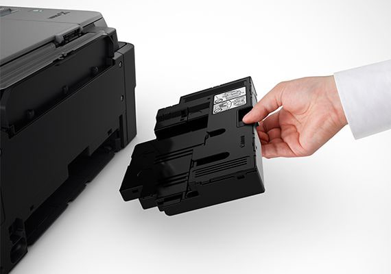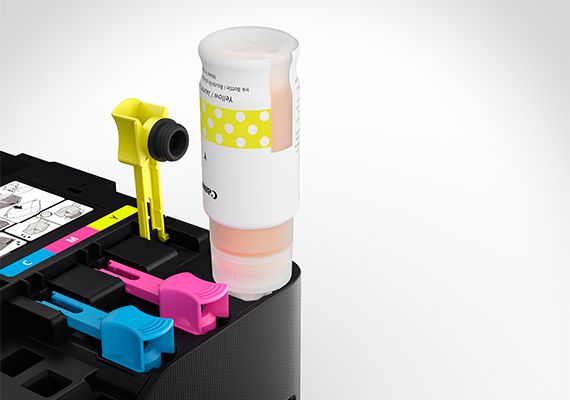 To prevent accidental mixing of coloured inks, each ink bottle tip is designed to fit only the specific colour tank. Ink refilling is a spill-free process, beginning automatically, and stopping when the ink tank is full.