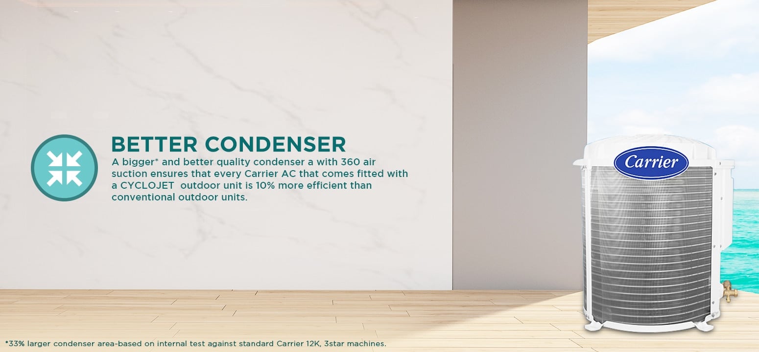 A bigger* and better quality condenser with a 360 air suction ensures that every Carrier AC that comes fitted with a CYCLOJET outdoor unit is 10% more efficient that conventional outdoor units.