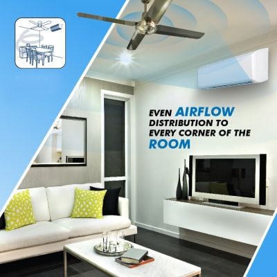 The powerful air draft does not fall on your head directly, but it is steered upward letting air circulate into the corners of the room creating a comfortable ambience.