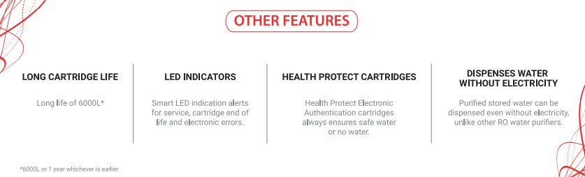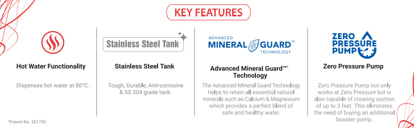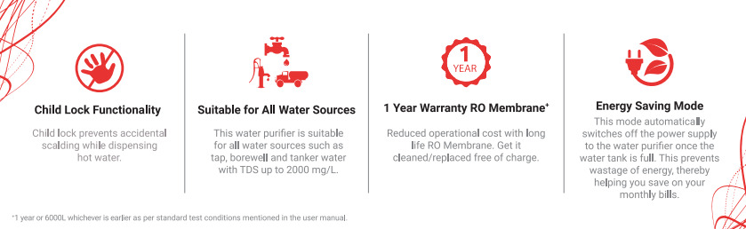 - Hot Water Functionality, Child Lock, Energy saving mode