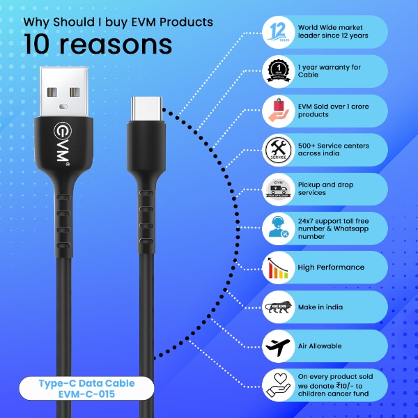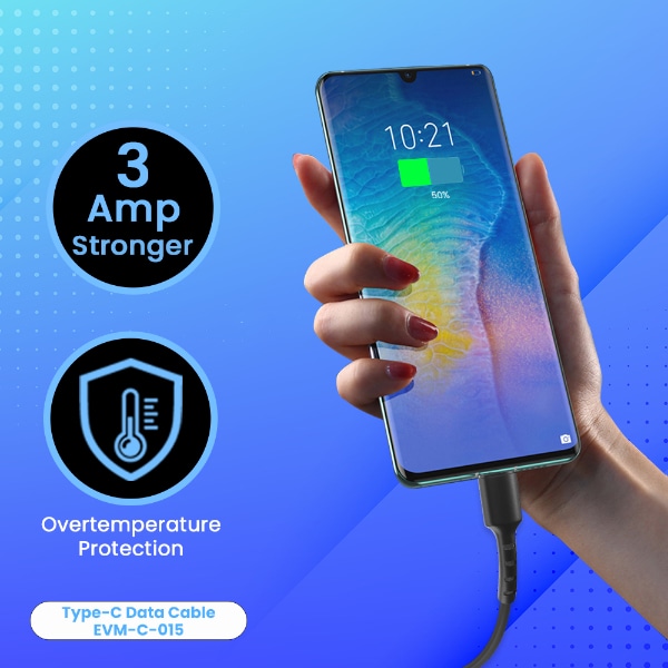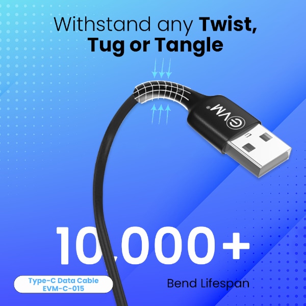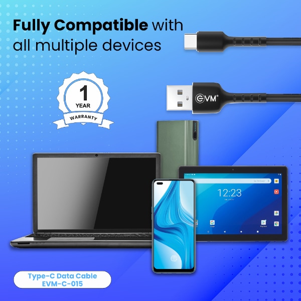 EVM C015 Data and Sync USB-C Cable, 3 AMP Strongest, 100 cm (1 m) Length, Compatible with multiple devices, Temperature Protection, Sturdy & durable, Tangle Free, Bulit-in 56 K resistant, Black