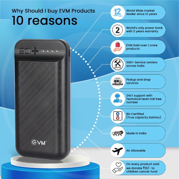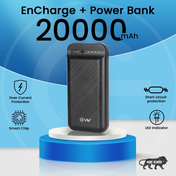 EVM Encharge Plus 20000 mAh Li-polymer Power Bank, Over Voltage Protection, Over Temperature Protection, LED Indicators, USB, Micro-USB, Type-C Ports, Black