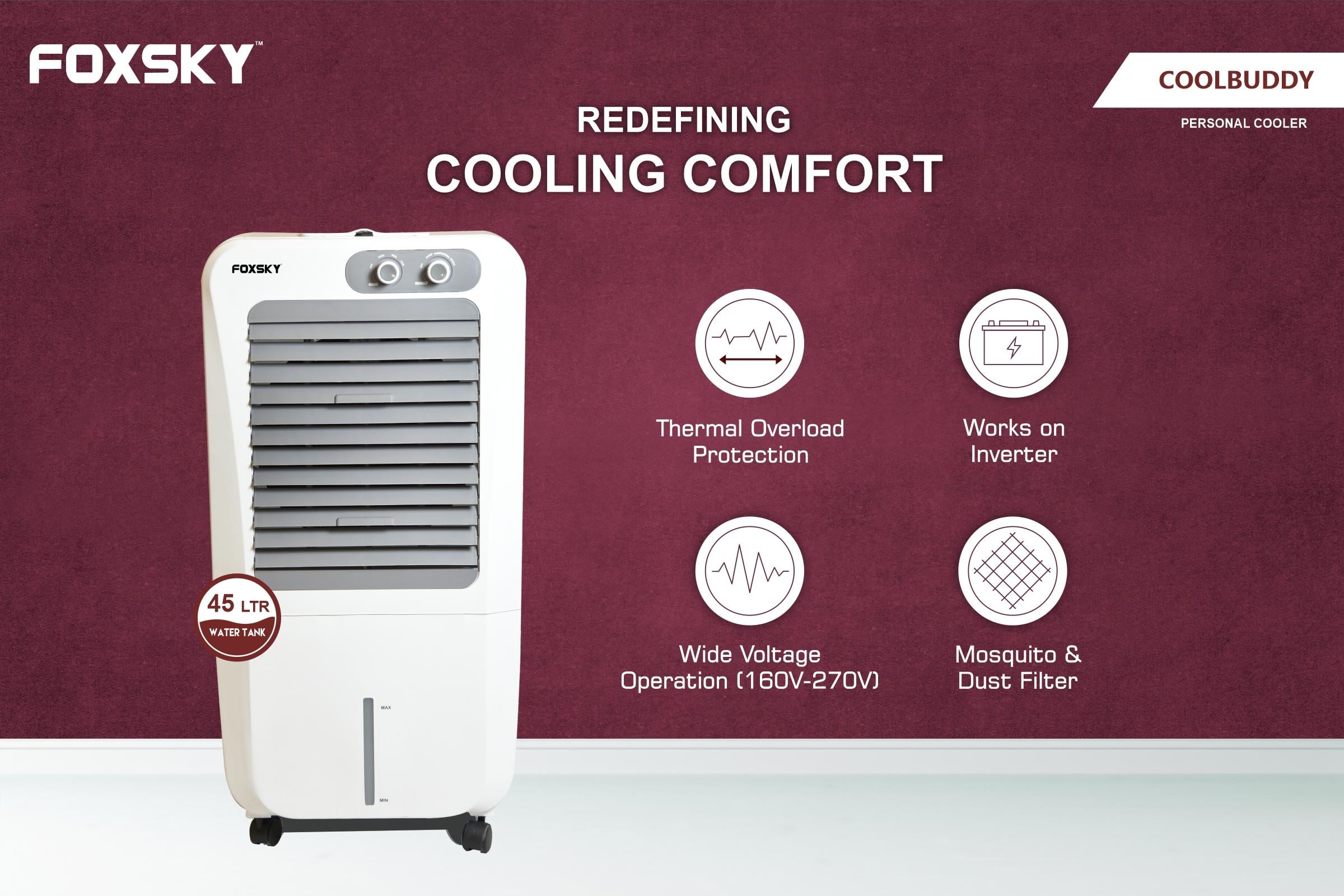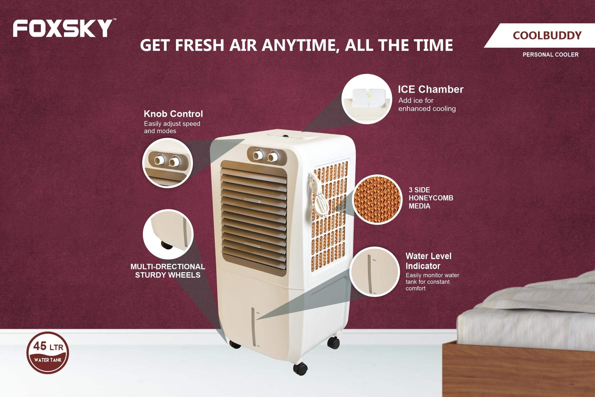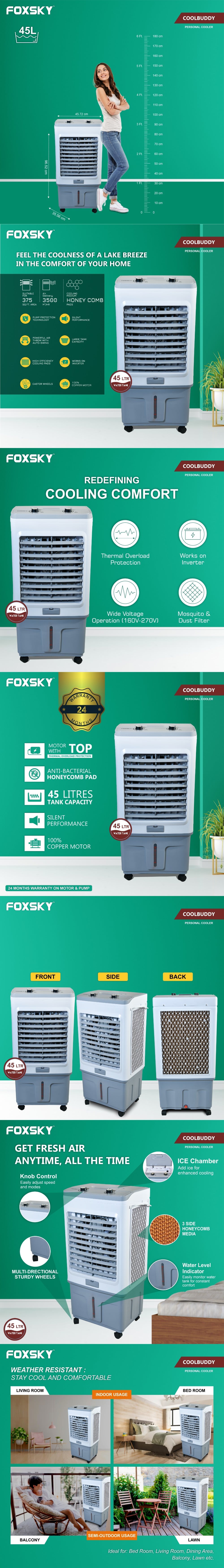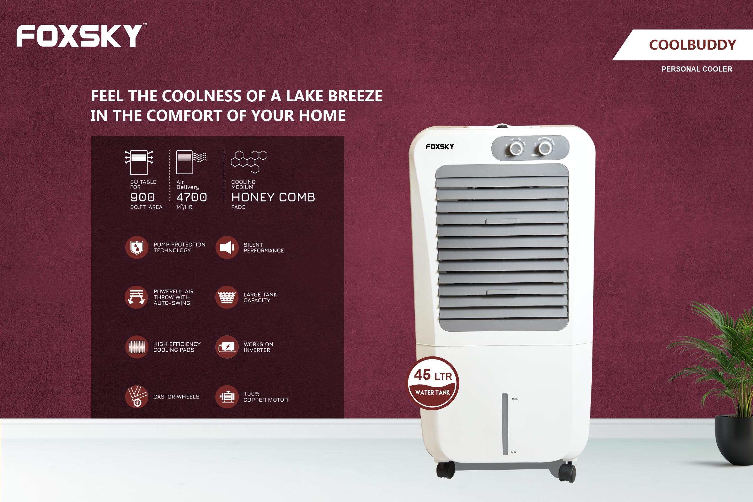 Foxsky Coolbuddy 45 L Personal Air Cooler with Honeycomb Cooling Pads, 100% Copper Motor