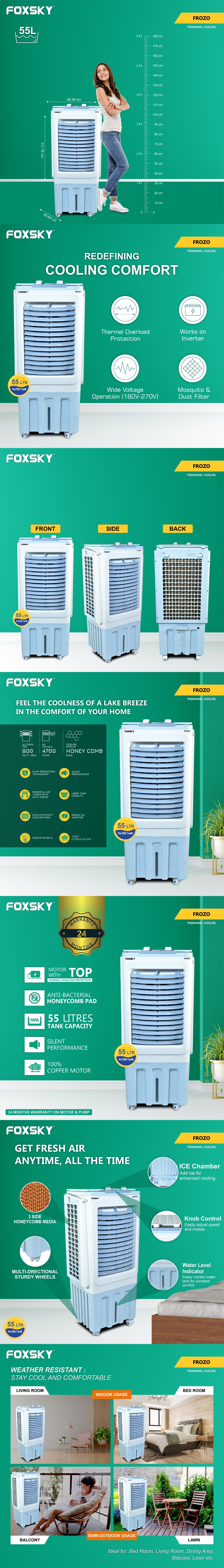 Foxsky Frozo 55 L Personal Air Cooler with Honeycomb Cooling Pads, 100% Copper Motor