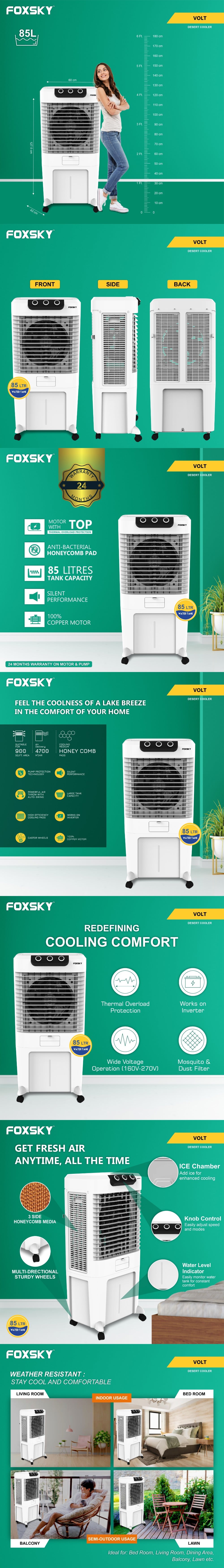 Foxsky Volt 85 L Desert Air Cooler with Honeycomb Cooling Pads, 100% Copper Motor