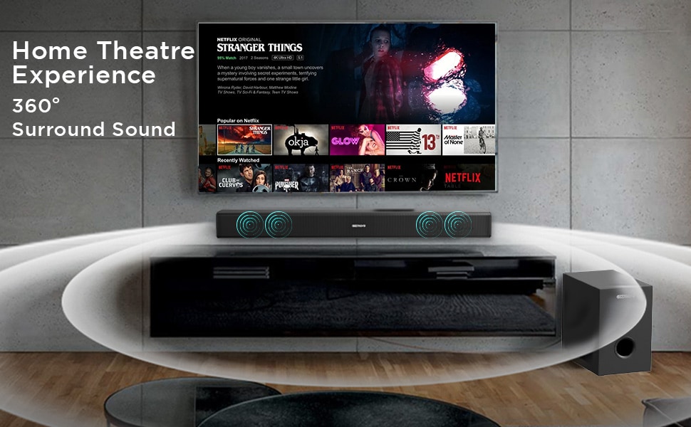 This feature suggests that the soundbar is designed to provide an immersive sound experience, delivering audio from various directions to create a surround sound effect.
