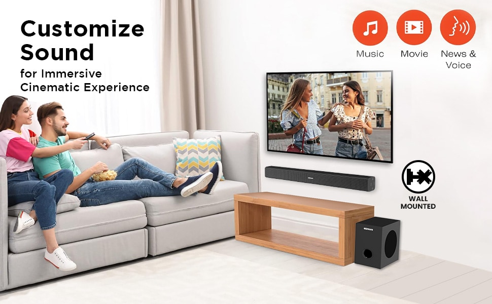 The soundbar is designed to be mounted on a wall, which can help save space and create a sleek, modern aesthetic look in your entertainment setup.