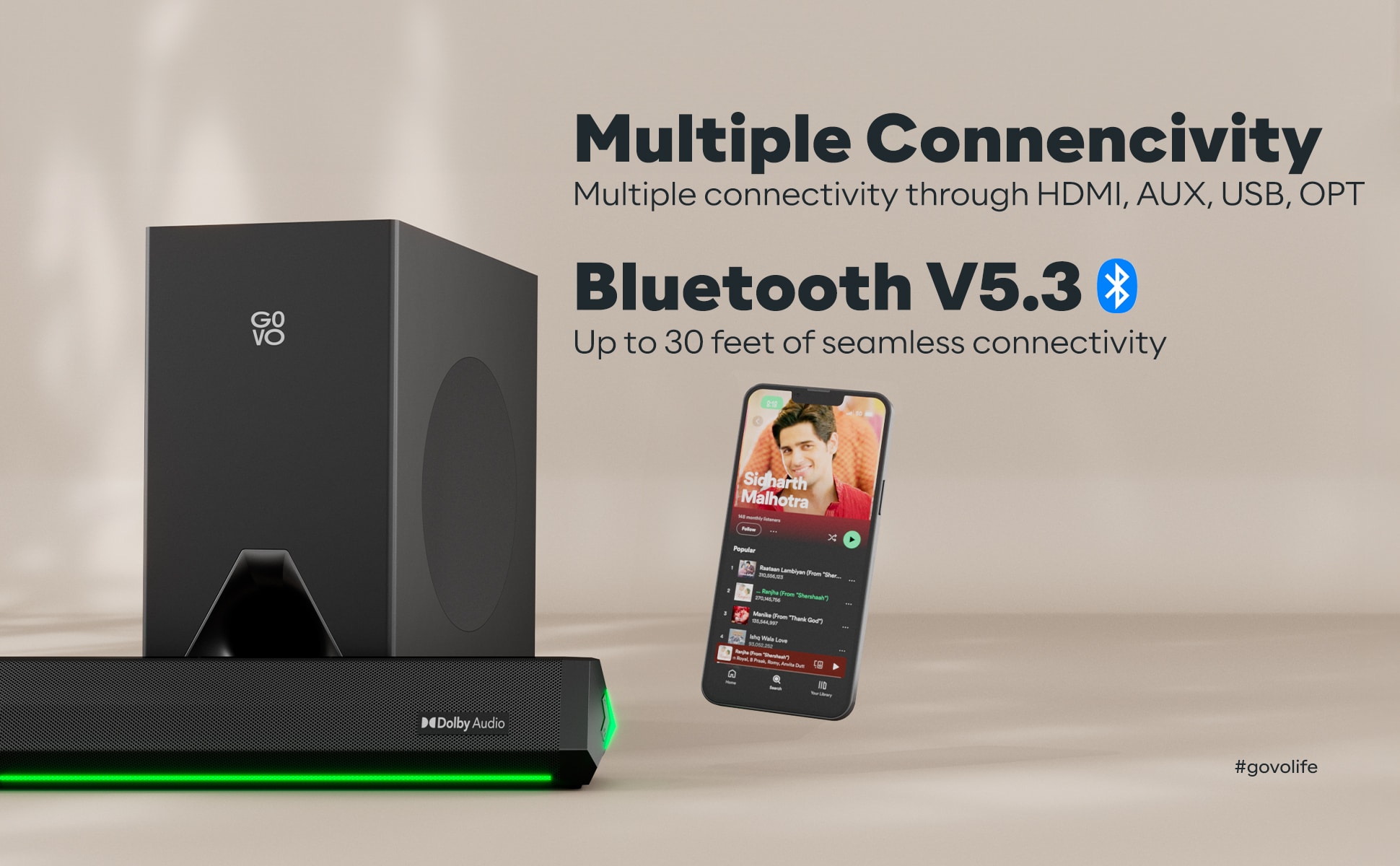 - Remote control: Adjust the Bass, treble & volume with the most stylish remote control Multiple Connectivity: Connect with HDMI (ARC), AUX, USB & OPT Bluetooth V5.3 : Connect automatically your mobile device and enjoy the music louder than ever