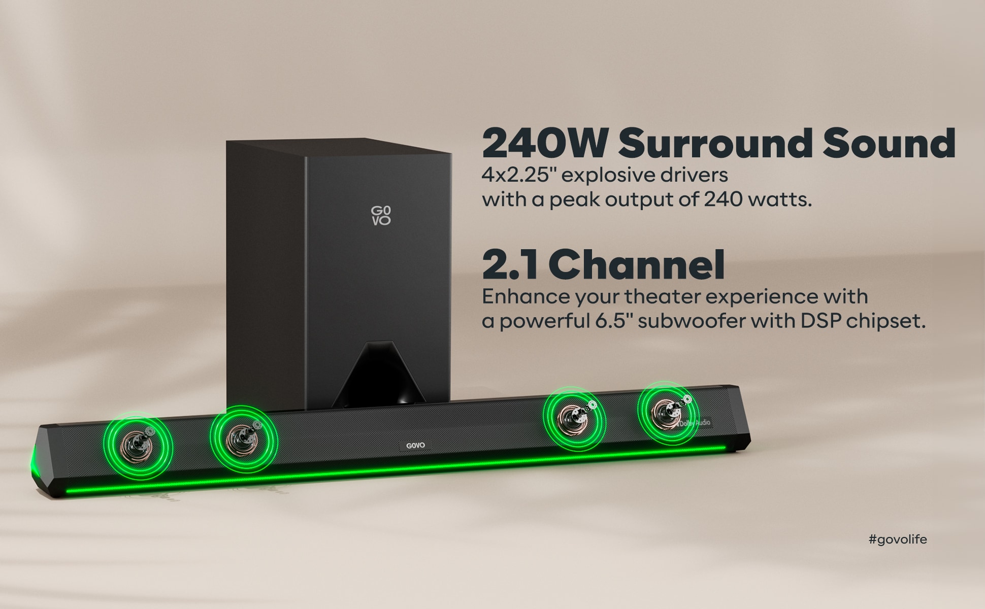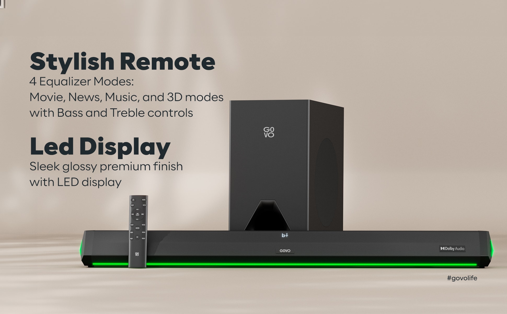 - Dynamic LED Lights: Get the acoustic experience to the next level with the most stylish LED lights in the GOVO's signature color 4 Equalizer Modes: Switch through Movie, News, Music & 3D modes, and enjoy your home cinema experience