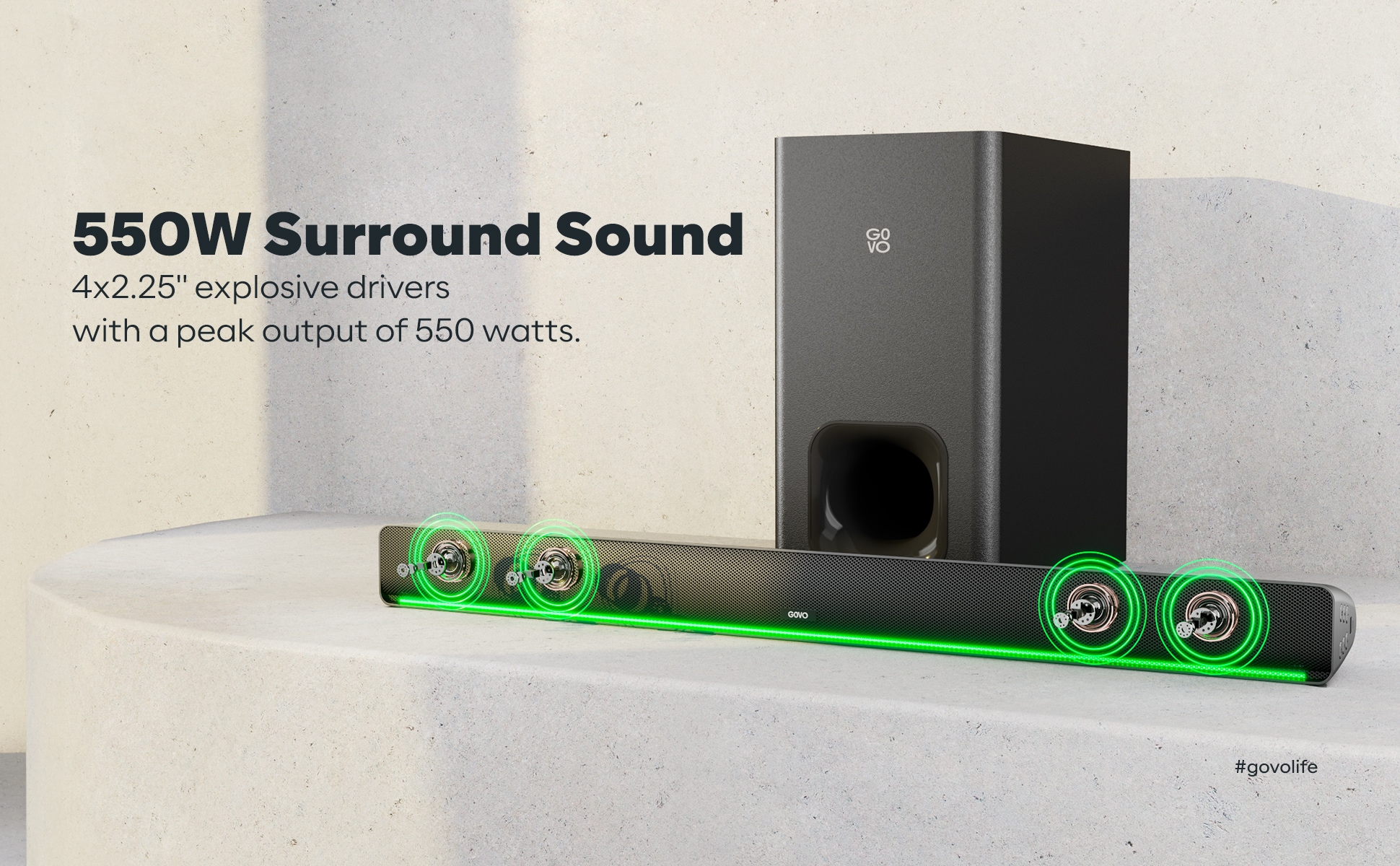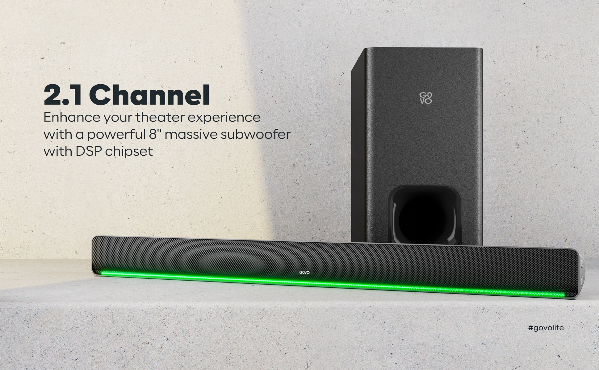 - 2.1 Channel: 4 x 5.71 cm (2.25 inch) speakers with 550 Watt peak output 3D Surround Sound DSP Enabled Subwoofer: Enjoy your theater experience with the deep bass of the 20.32 cm (8 inch) subwoofer