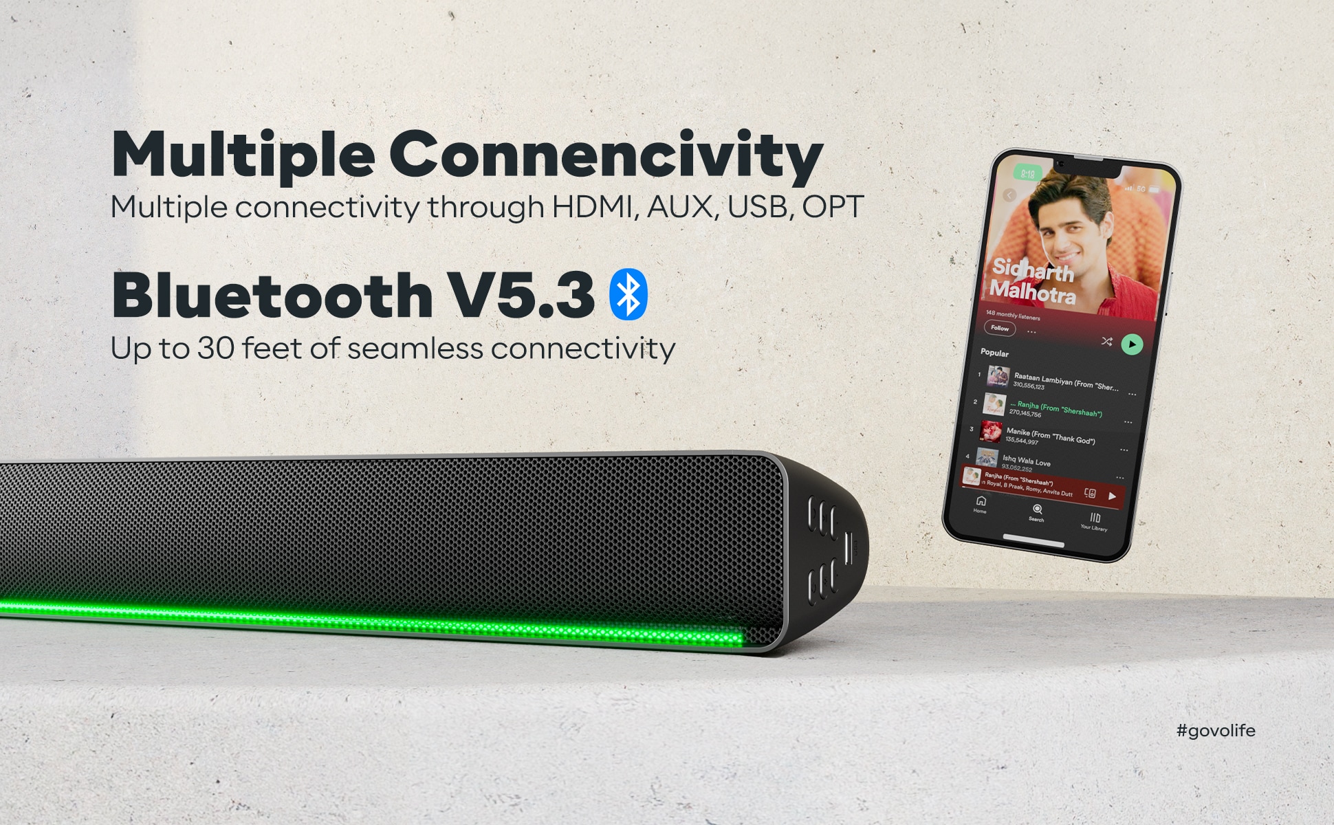 - Remote control: Adjust the Bass, treble & volume with the most stylish remote contro Multiple Connectivity: Connect with HDMI (ARC), AUX, USB & OPT Bluetooth V5.3 : Connect automatically your mobile device and enjoy the music louder than ever