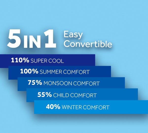 The 5 In 1 Easy Convertible option lets you convert your AC into 5 different modes based on your needs and convenience. The air conditioner can easily be converted to any tonnage based on ones' requirement thus giving you more energy savings.