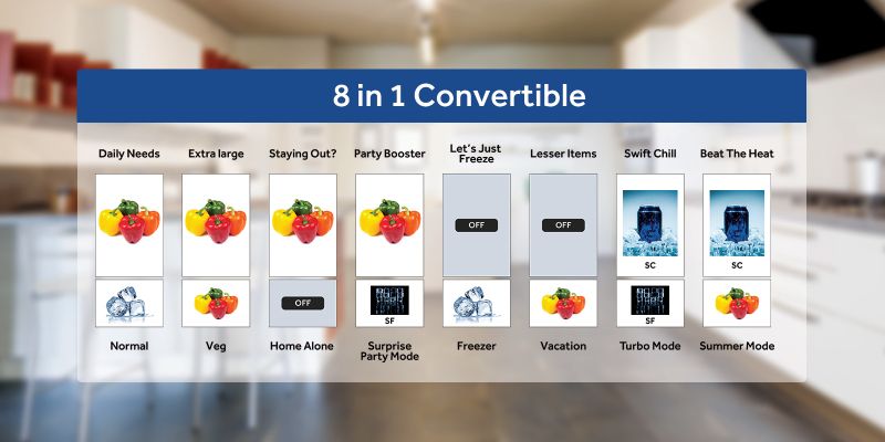 8 Convertible modes allows you to conveniently store & organize your food items in the refrigerator. The 8 modes are precisely designed to smartly cater your refrigerator needs and usage patterns.