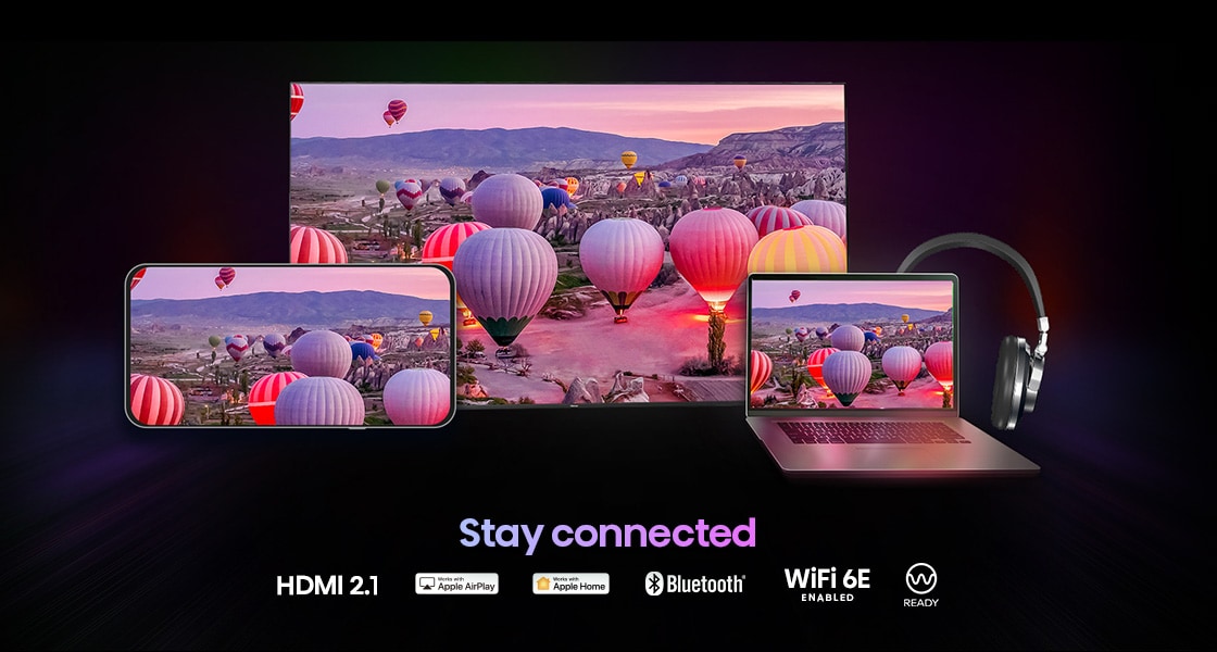 Add all external devices with state-of-the-art wireless and wired connectivity. HDMI 2.1, AirPlay, Bluetooth, Share to TV, WISA Ready