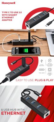 Honeywell 4-in-1 Type C 3.1 to USB 3.0 with RJ45 Gigabit Ethernet Adapter, 3x3.0 USB Ports Transfer Speed 5Gbps, 1Gbps Bandwidth, Universally Compatible with all Type C MacBooks, laptops, PCs, Tablets