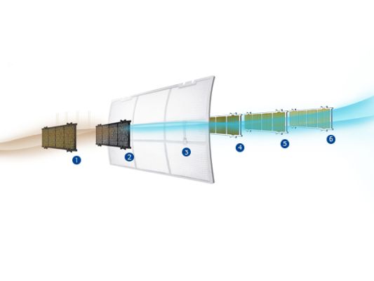 Breathe 6 times cleaner air, Vitamin Enriching Filter, Activated Carbon Filter, Dust Filter, Nano Filter, Anti-bacterial Filter, Catechin Filter.