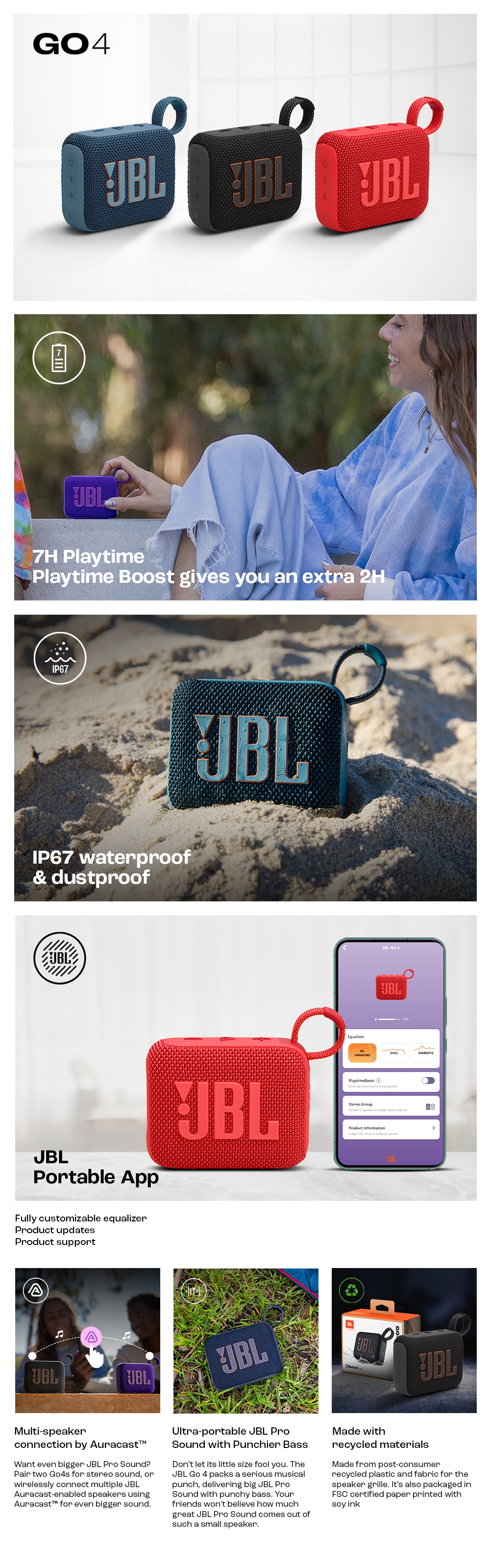 - Ultra-portable JBL Pro Sound . The JBL Go 4 packs a serious musical punch, delivering big JBL Pro Sound with punchy bass. Your friends won’t believe how much great JBL Pro Sound comes out of such a small speaker