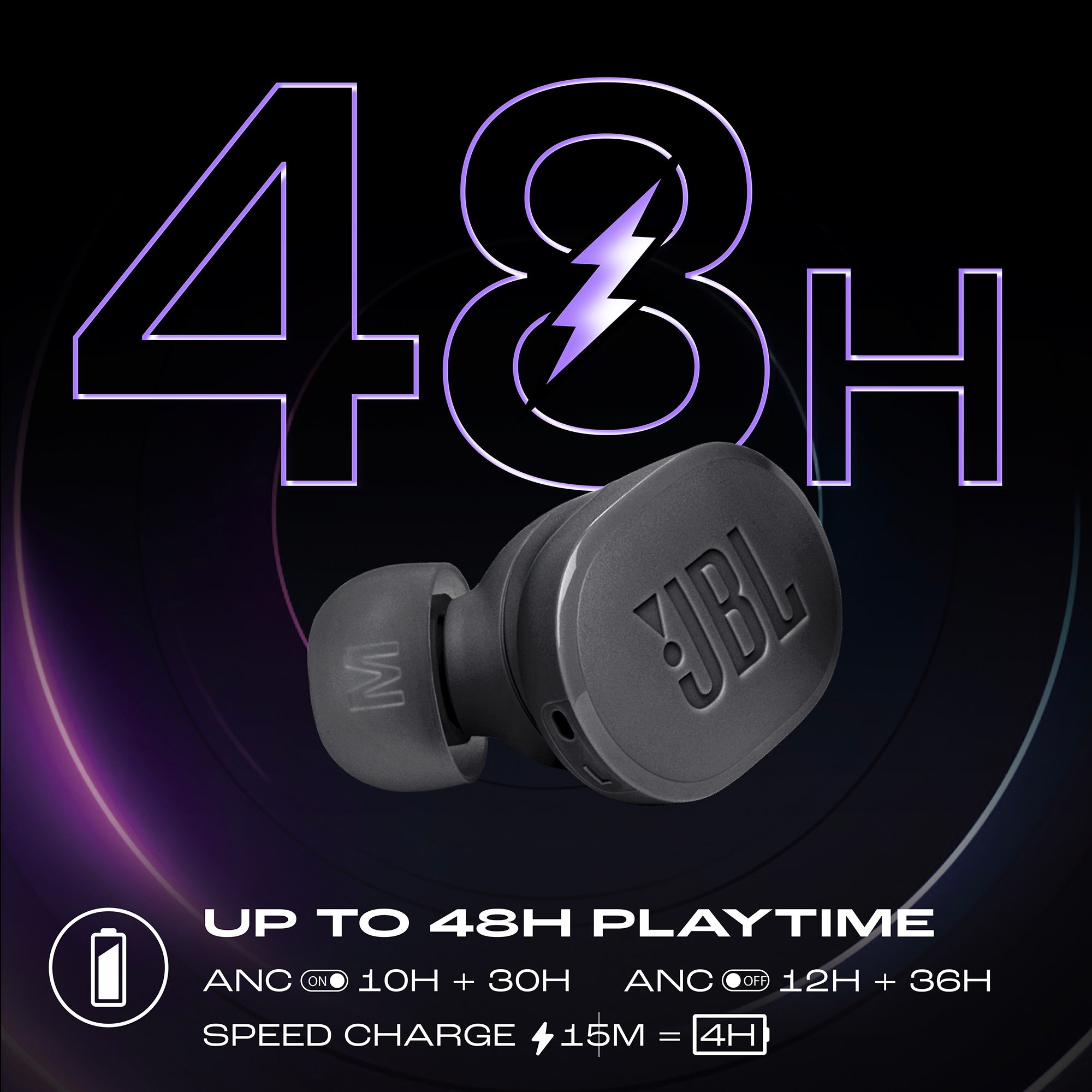 - LONG PLAYTIME WITH QUICK CHARGE: You can enjoy uninterrupted music with a total of 48 (12+36) hours of battery life, or 10 hours of playtime with an additional 30 hours provided by the charging case when the noise cancelling feature is activated. If you need a quick power-up, simply charge for 15 minutes with Speed Charge to obtain an additional 4 hours of playtime