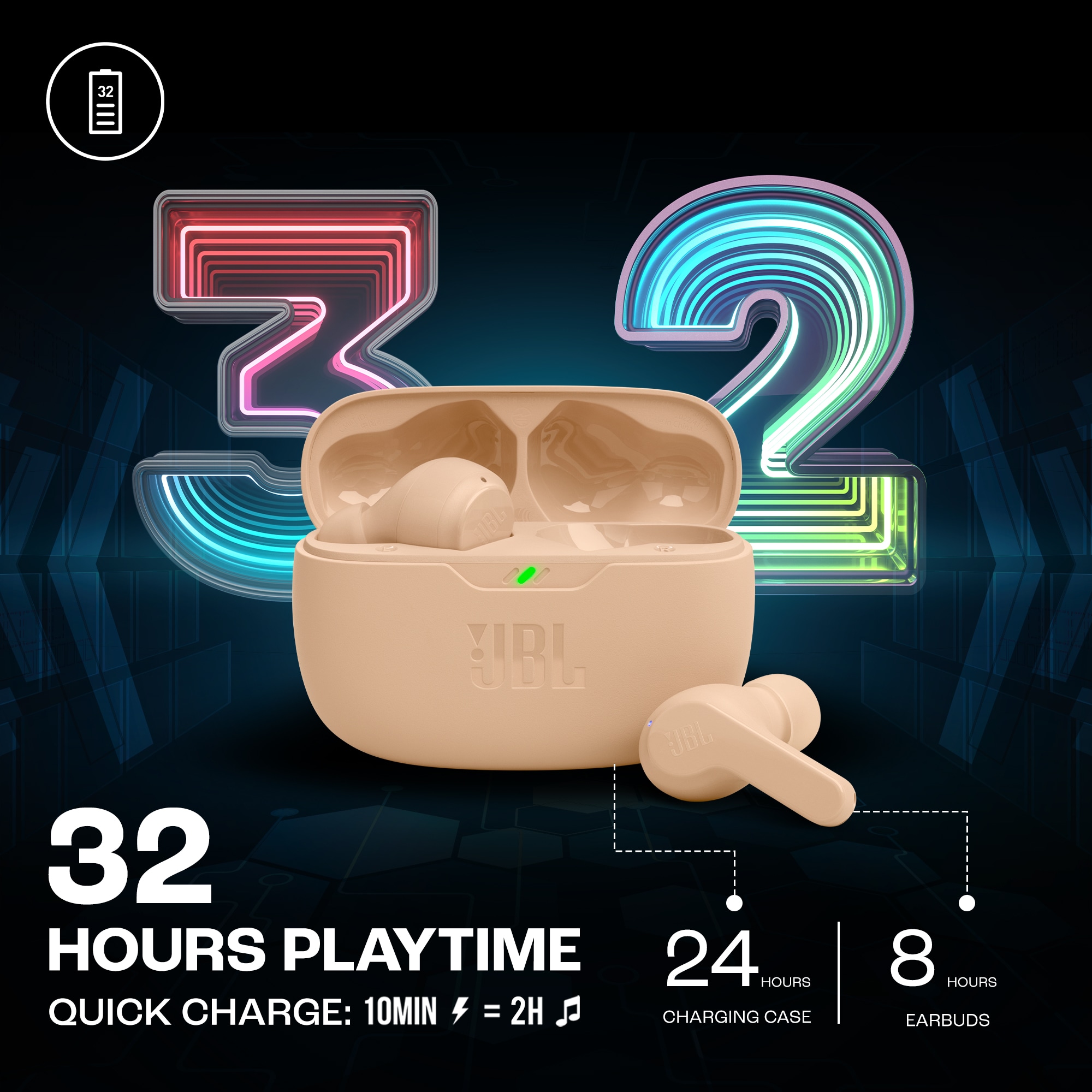 - Up To 32 (8 h + 24 h) TOTAL HOURS OF BATTERY LIFE WITH QUICK CHARGING: With 8 hours of battery life in the earbuds and 24 hours in the case, the JBL Wave Beam provide all-day audio. And when you need more power, you can speed charge an extra two hours in just ten minutes