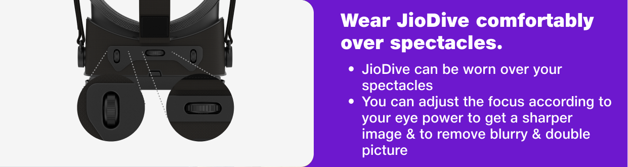 * This JioDive Smartphone image is for illustration purpose only. Actual image may vary.Wondering if you can use JioDive seamlessly over your spectacles? Yes, you can. This VR headset is designed to provide a seamless VR experience, with or without spectacles. You can not only wear the device over glasses, but also adjust the focus (up to a certain level) according to your eye power for the optimal viewing experience.