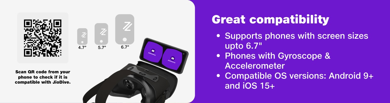 Compatible With 700+ PhonesJioDive and the JioImmerse app are compatible with 700+ Android and iOS phone models, of display sizes between 4.7 and 6.7 inches, and are equipped with a Gyroscope and an Accelerometer. The compatible OS versions are Android 9 or above and iOS 15 or above. To check if your phone is compatible with JioDive, install the JioImmerse app from Google Play Store or Apple App Store, go to the profile section, and click on 'Phone Compatibility'. Additionally, you can also visit www.jio.com/dive/device-compatibility to check phone compatibility.