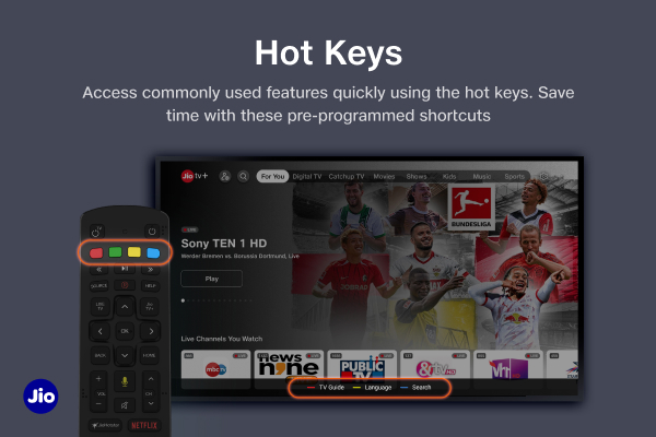 Control Your Entertainment EffortlesslyWhether you’re browsing OTT apps, switching channels or adjusting volume, the Jio Voice Remote delivers faster navigation and smooth performance — every time.