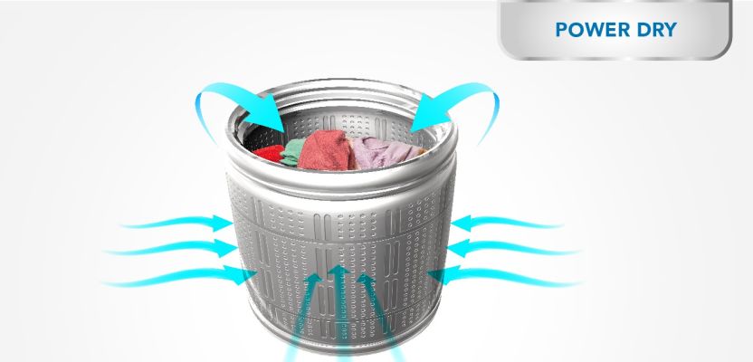The Power Dry feature, with 10 minute Spin Timer, Higher RPM motor and Special vents on spin lids, spin tub draw air from your home and circulate around spin tub which helps to dry the cloths faster.