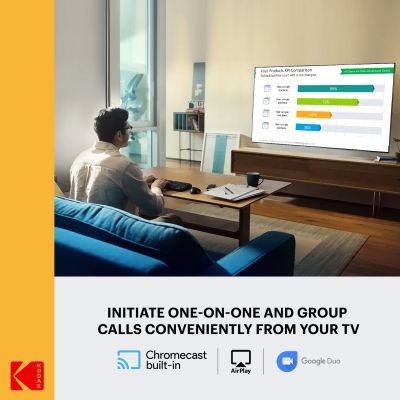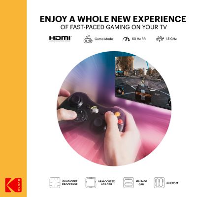 - DescriptionWhether you're watching a movie, your favorite TV show, or playing a game on a console with your friends, this Kodak CA PRO Series TV is here to take your entertainment experience to a whole new dimension. This TV comes with a user-friendly Android 10 interface which gives you smooth viewing experience. The available 4k HDR 10 delivers stunning visuals and Dolby Digital Plus with DTS TruSurround delivers impeccable audio quality, the combination of these visual and audio technologies gives you a true cinematic experience in your living room. Multiple connectivity options with USB 2.0, HDMI ARC/CEC and Bluetooth v.5.0 with user-friendly remote, with dedicated hotkeys, help you to enjoy seamless entertainment.