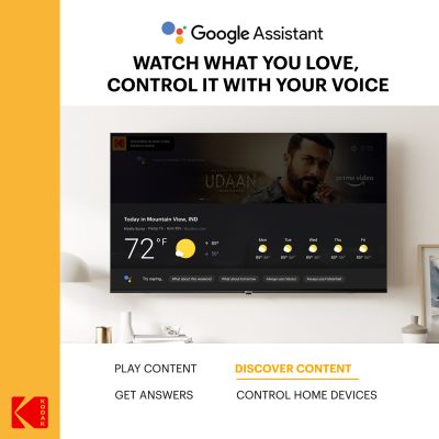 Voice Search all your content with Goggle assistant enabled remote. The best part is that you don’t have to pause what you’re watching. Just press the Google Assistant button on the remote and start exploring. Enjoy smart home experience with all new Kodak TV.