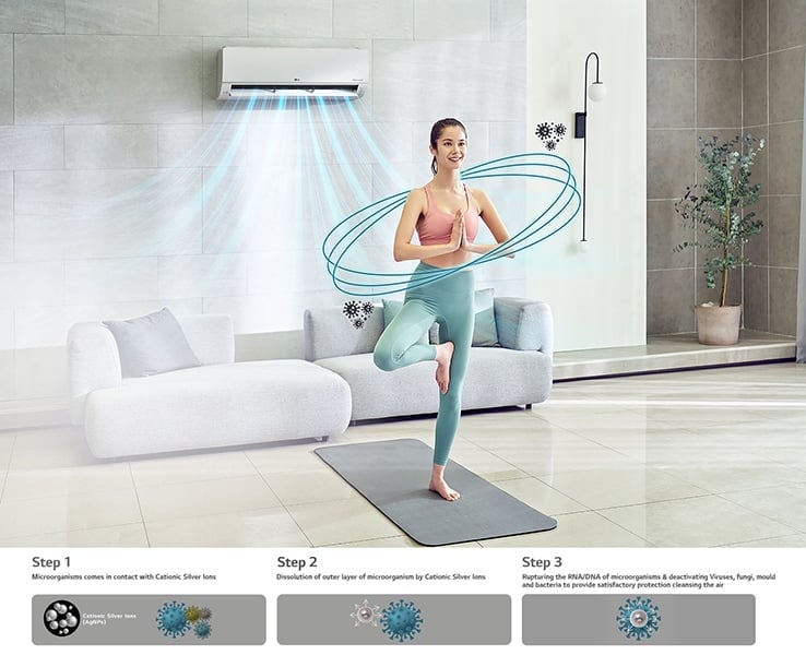 LG DUAL Inverter Air Conditioner now comes with an ‘Anti-Virus’ protection layer fitted HD Filter. The filter mesh is coated with Cationic Silver Ions (AgNPs) that deactivates more than 99% Virus# and bacteria in contact. To be precise, it demobilizes up to 99.76% Virus and up to 99.99% bacteria cleansing.