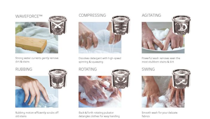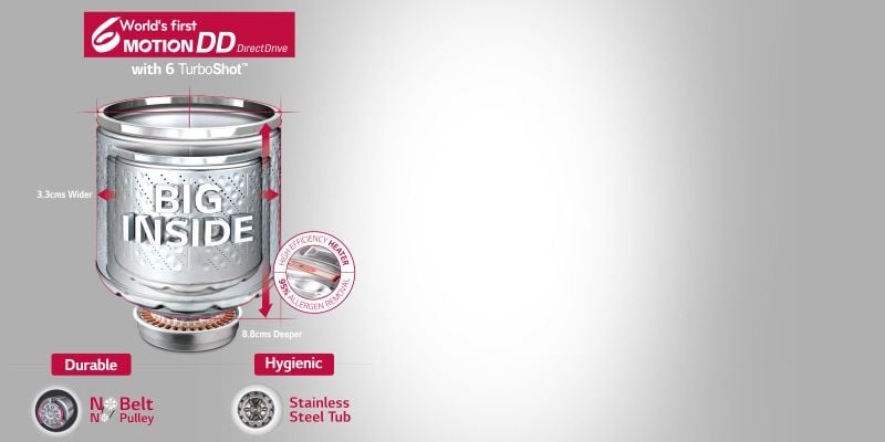 6 Motion Technology with 6 different types of motions- Scrubbing, Rolling, Stepping, Swing,Tumbling and Filtration, combines the force of water and the rhythm of motion to cater to all kinds of washing needs. Depending on the type of cloth & dirt level, clothes are washed changing the motions. It also provides you less damaged, less tangled and cleaner clothes.