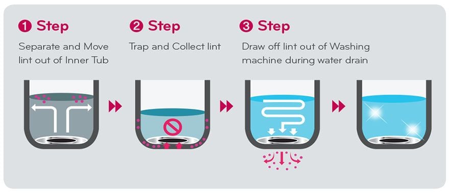 Lint gets out of tub by water flow during washing cycle, and it is filtered on the bottom of the tub.And then the collected lint gets washed away automatically during drain cycle.