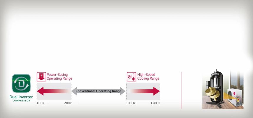 LG ACs have varied speed Dual rotary compressor with wider rotational frequency range, to ensure faster cooling and more efficiency