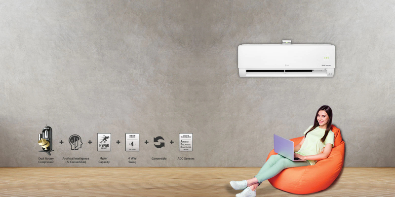 LG’s DUAL Inverter Air conditioners with variable tonnage technology are now smarter with the addition of Artificial Intelligence. The AI Dual Inverter predicts not only the appropriate cooling capacity, but also senses room conditions, and it chooses the required fan speed, Vane position and temperature settings.