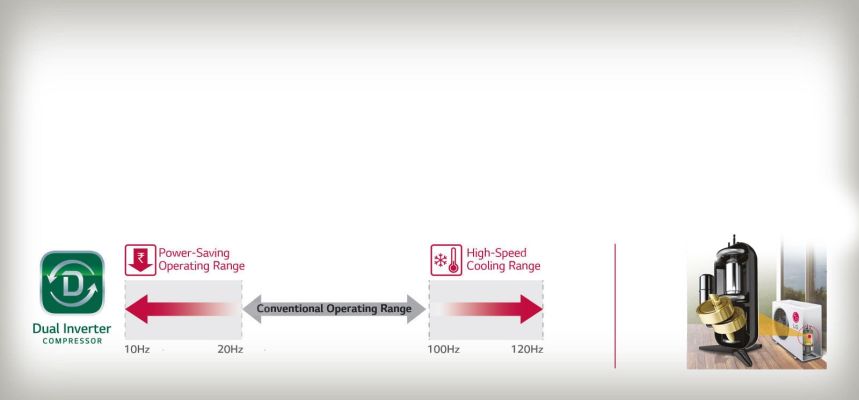 LG ACs have varied speed Dual rotary compressor with wider rotational frequency range, to ensure faster cooling and more efficiency
