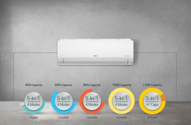 LG DUALCOOL AC with Super Convertible 5-in-1 Cooling Control, you can not only save a lot of energy by stepping down the cooling capacity from 100% to 80%, 60% or 40%, but even increase the cooling capacity to 110% when faster cooling becomes most important.